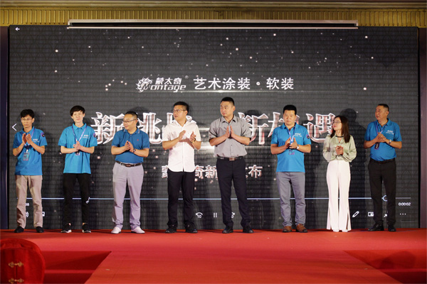 此次活動很大亮點當(dāng)數(shù)新品發(fā)布。現(xiàn)場,中國建筑裝飾裝修材料協(xié)會硅藻泥分會朱秘書長、蒙太奇董事長趙廣全攜公司高層領(lǐng)導(dǎo)、優(yōu)秀經(jīng)銷商代表依次登臺,伴隨音樂,共同按下啟動按鈕。當(dāng)主屏幕蒙太奇新品發(fā)布會主形象呈現(xiàn)時,預(yù)示著蒙太奇新品將正式與大家見面。