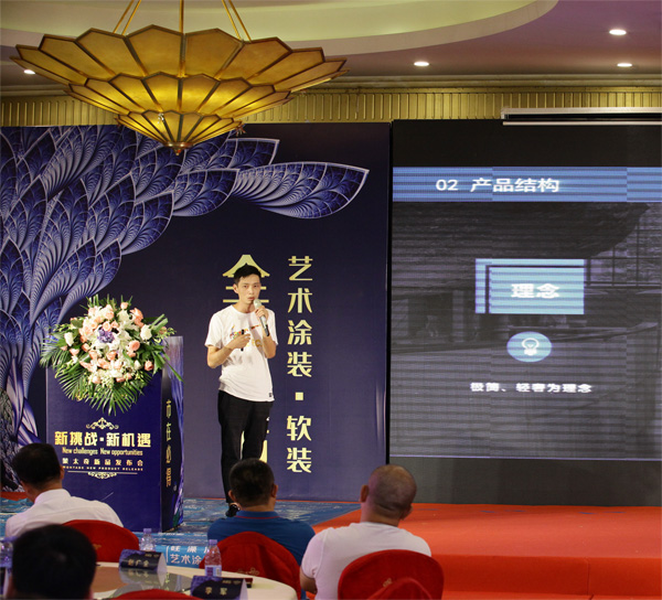 現(xiàn)場,蒙太奇技術(shù)總監(jiān)羅總對藝術(shù)涂料,從起源到應(yīng)用進行多方面分析,讓經(jīng)銷商深入了解蒙太奇藝術(shù)涂料新品。