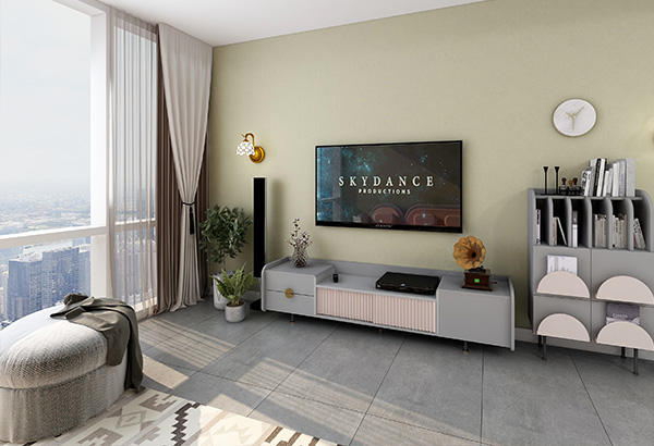 電視墻一般與頂面的局部吊頂相呼應(yīng),吊頂上一般都有燈,所以要考慮墻面造型與燈光相呼應(yīng),照明燈的顏色和強(qiáng)度也應(yīng)該留意,不要運(yùn)用瓦數(shù)過大或顏色太耀眼的燈泡,這樣在觀影時(shí)才不會有雙眼刺痛或眩暈的感覺。